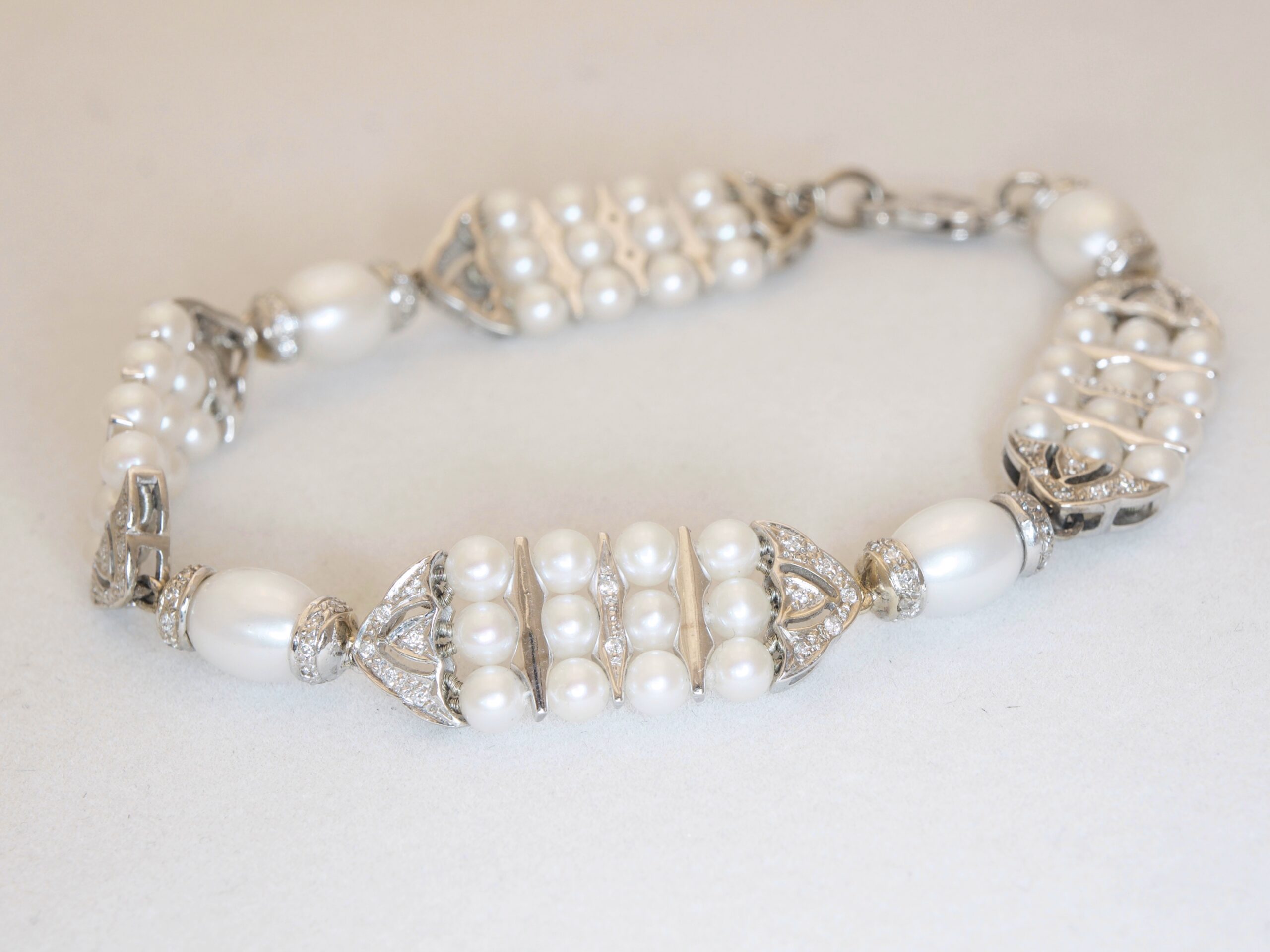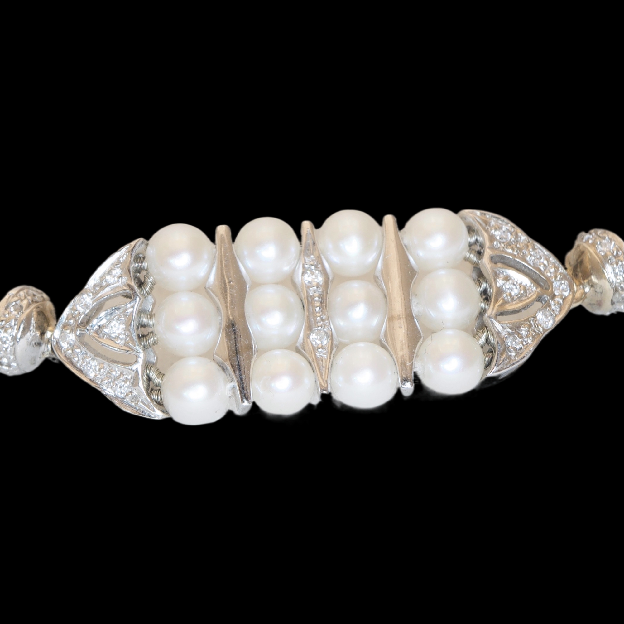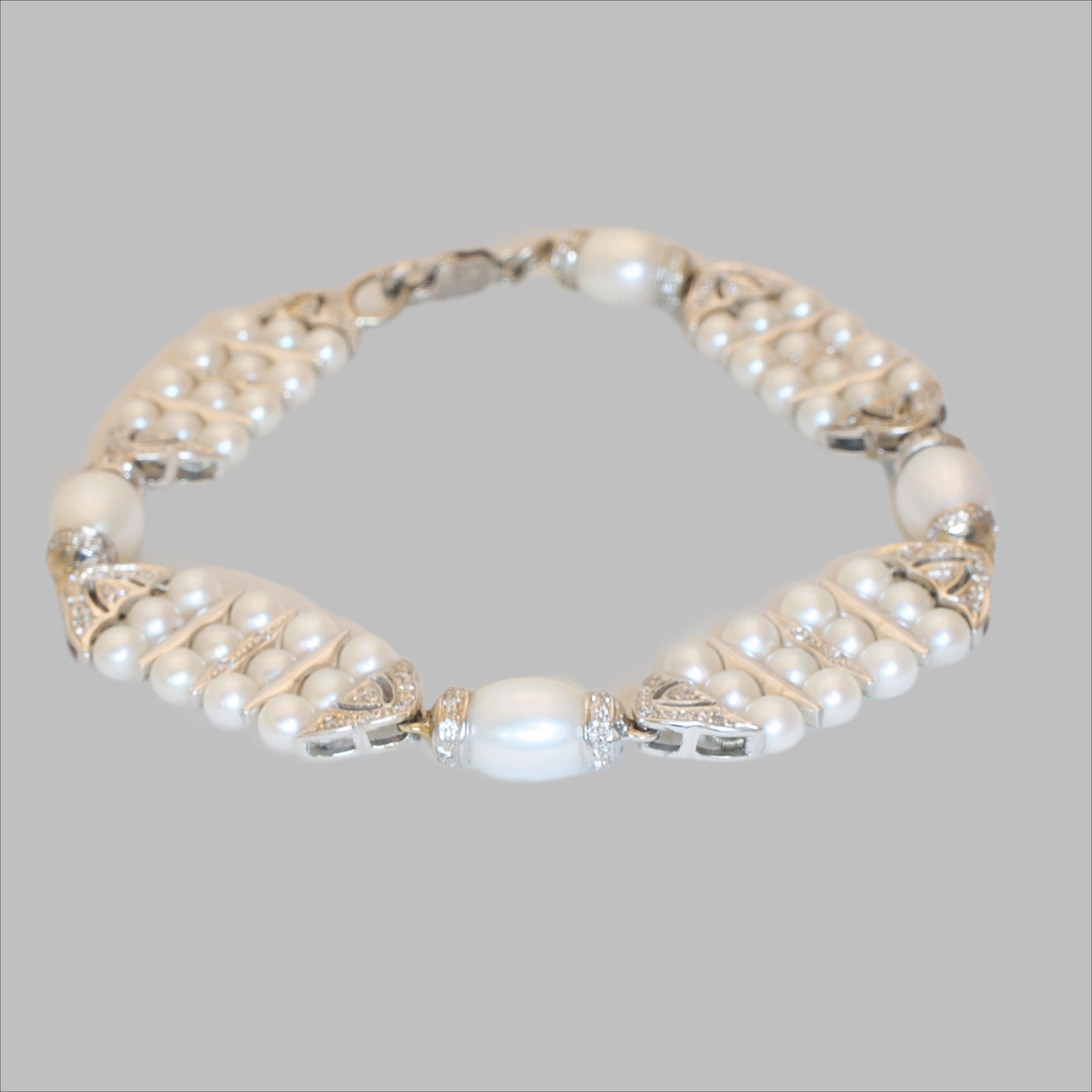 18 ct white gold linked bracelet. Featuring four links each with 12 pearls and 14 diamonds , joined by four oval pearls each with 16 diamonds .