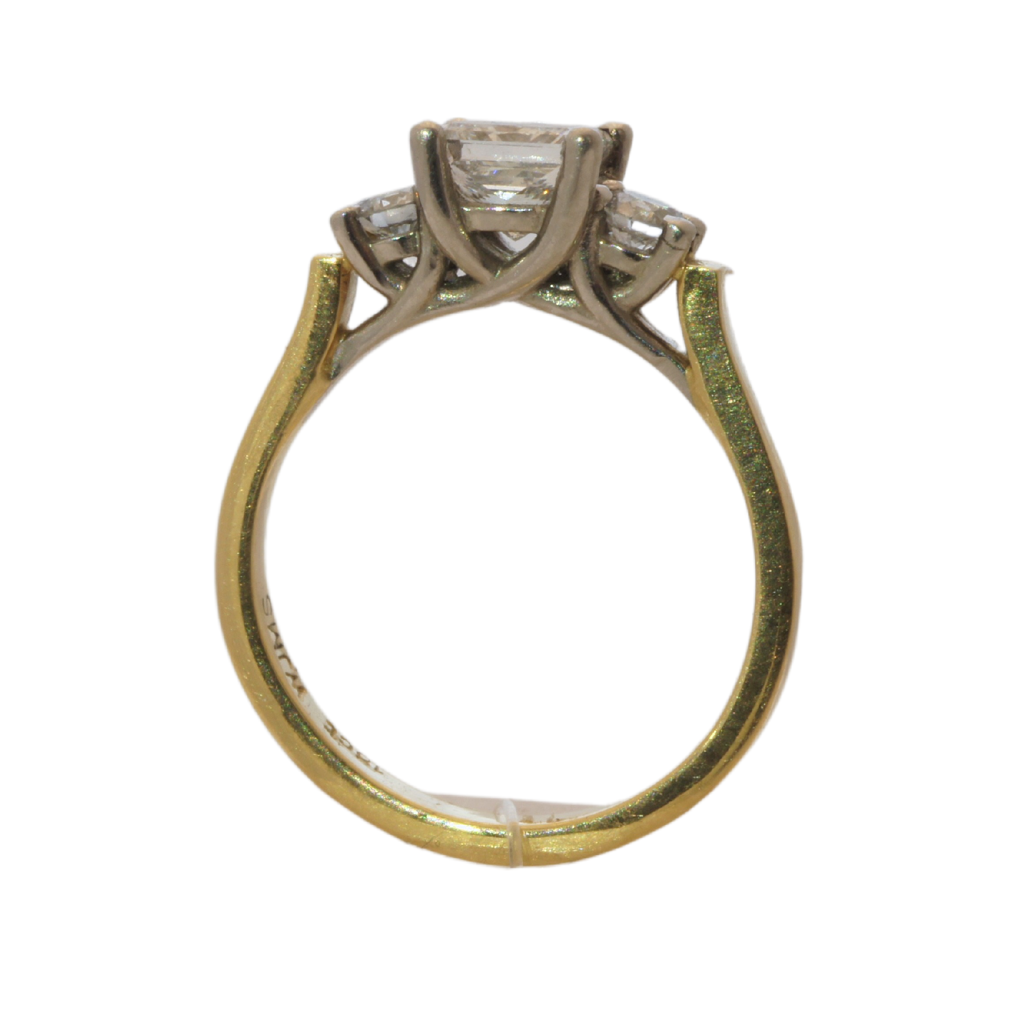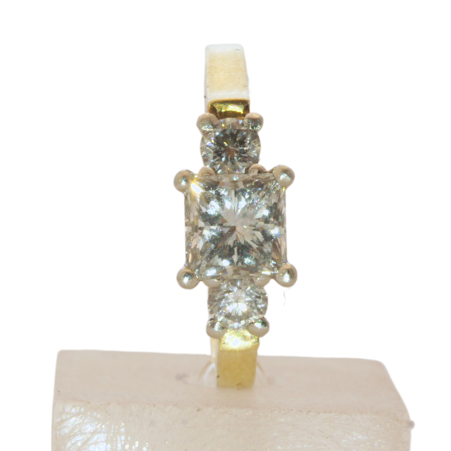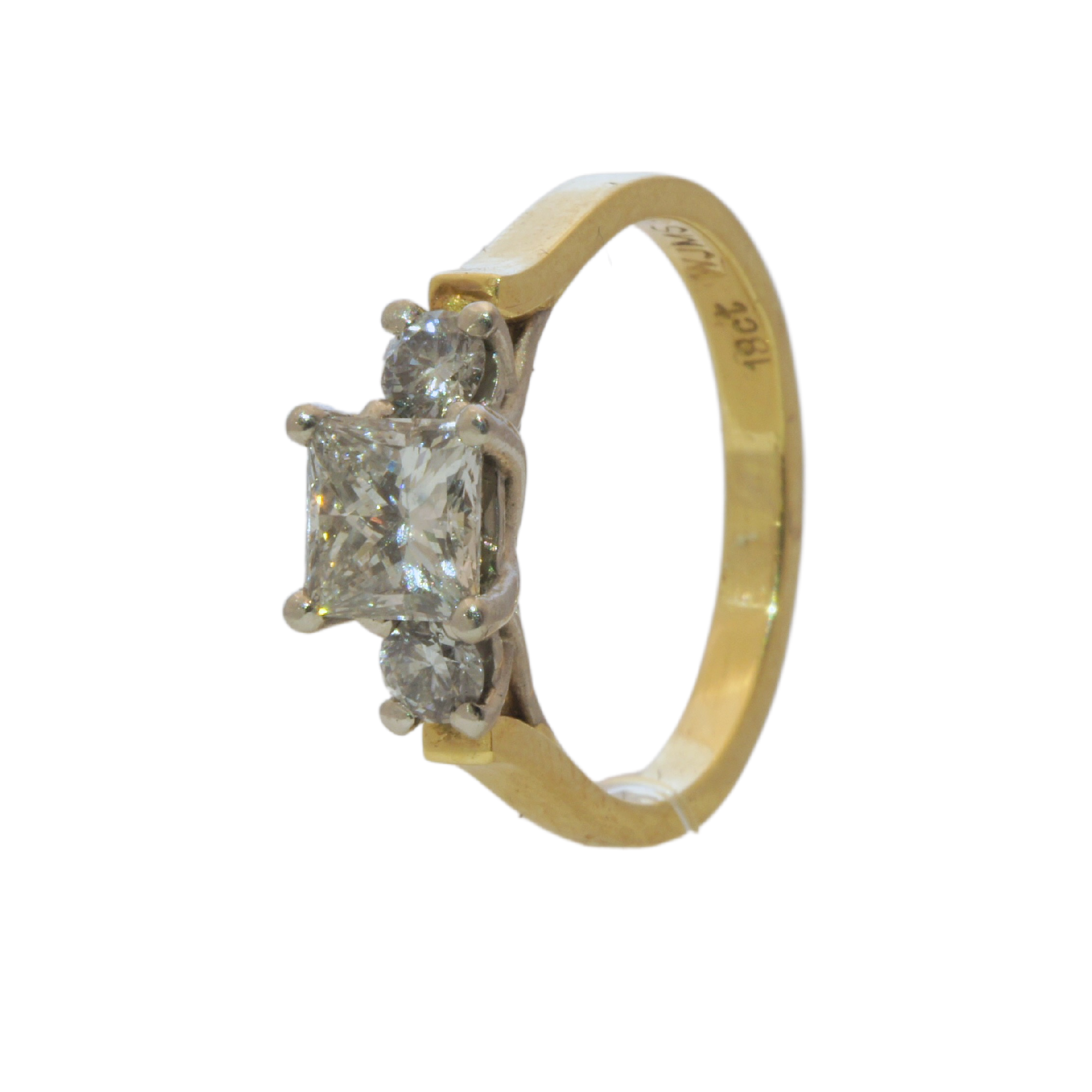 This 18ct yellow gold 3 stone ring with a 1ct Princess H SI1 natural diamond, with a 0.15 ct round brilliant cut natural diamonds either side, all mounted in an elegant platinum setting.