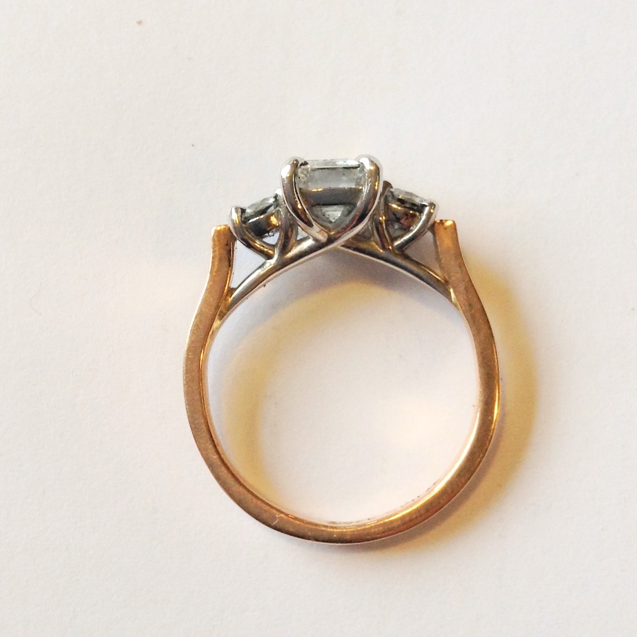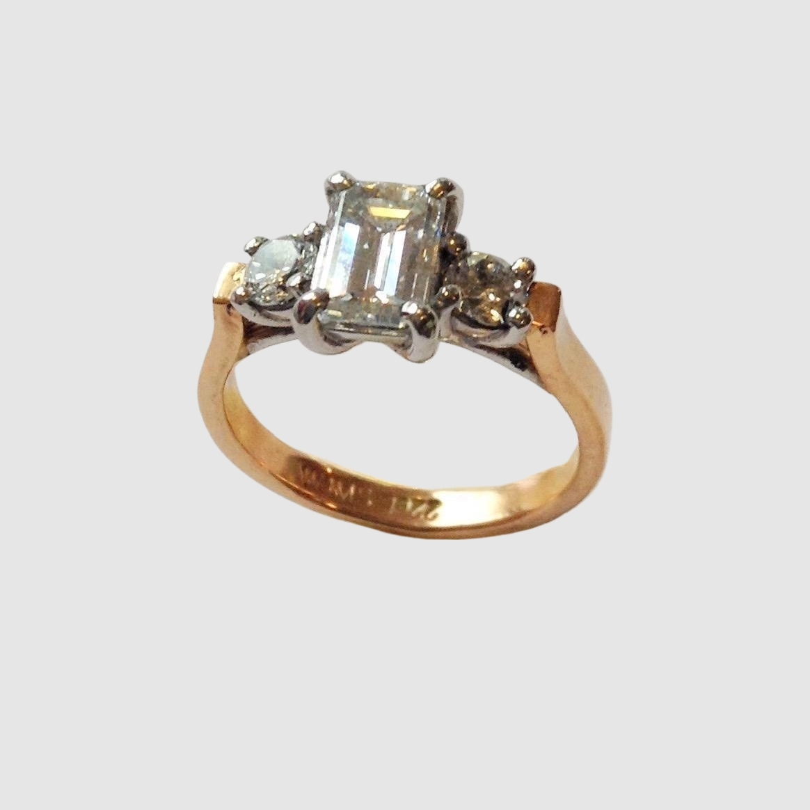 Making of a 22ct rose gold three stone ring. Centre stone is a 1ct Emerald cut Diamond and a 1/4 ct round diamond either side,set in a platinum mount.