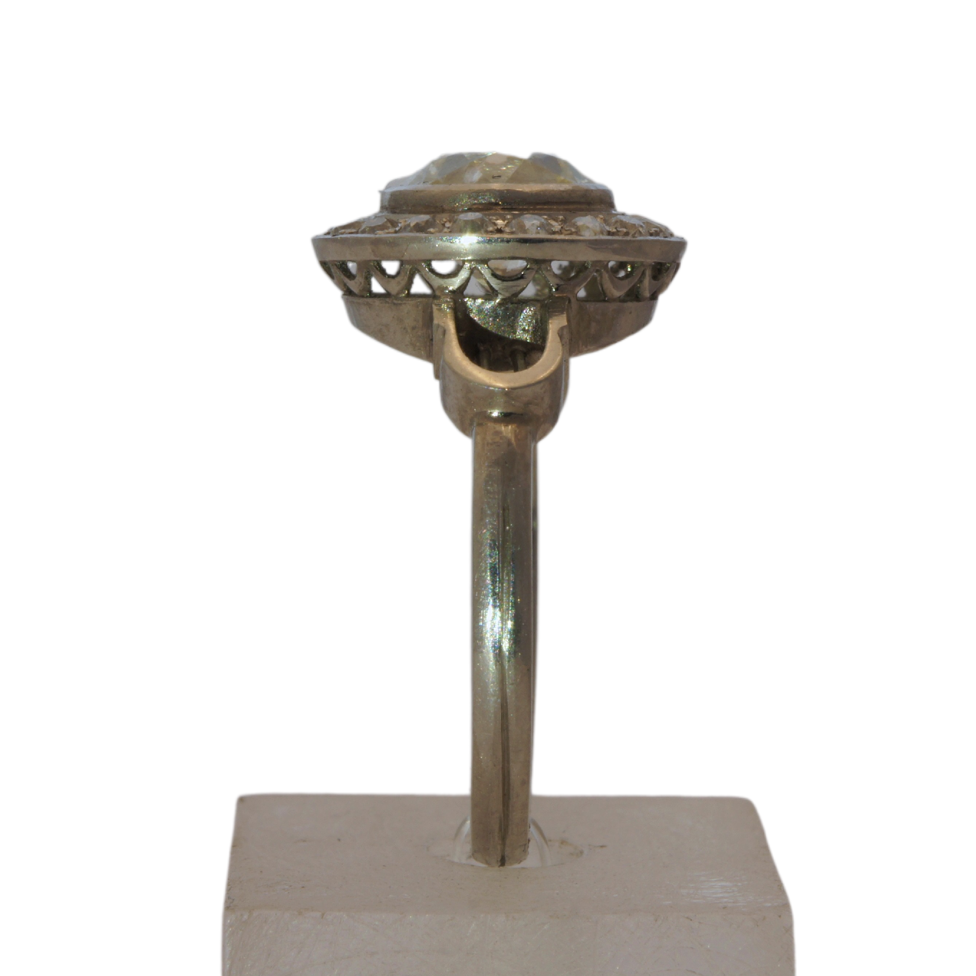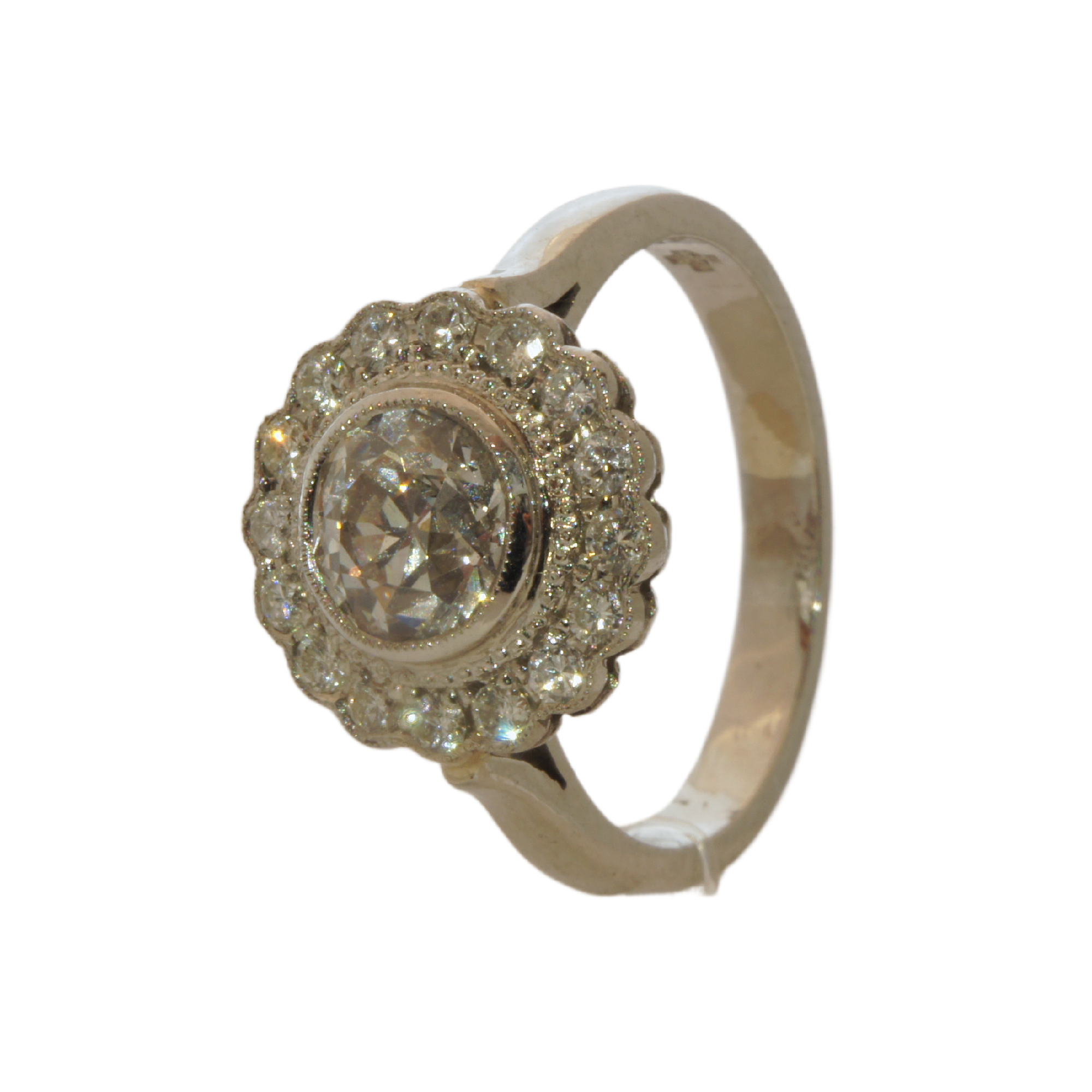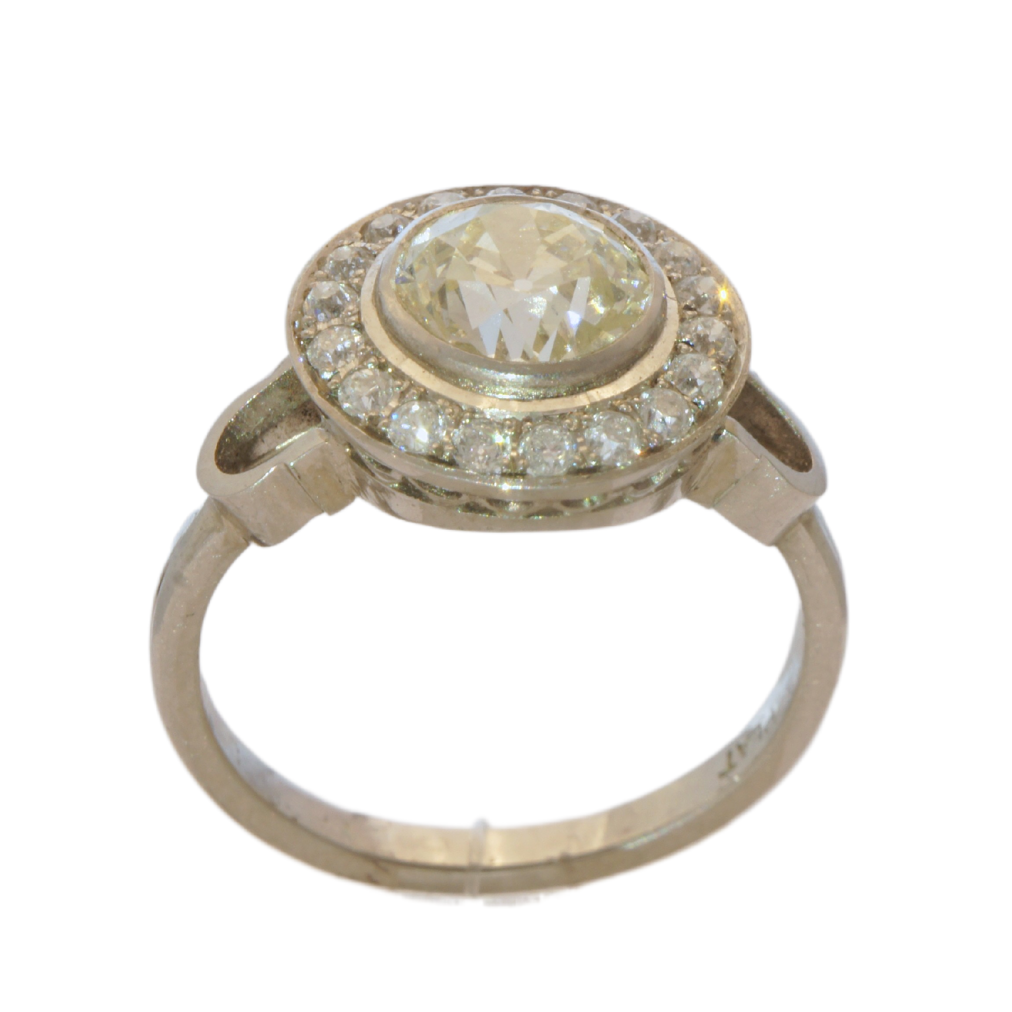 Platinum mounted diamond cluster ring, featuring a 2.1ct KSi1 diamond surrounded by 18 round brilliant cut diamonds.