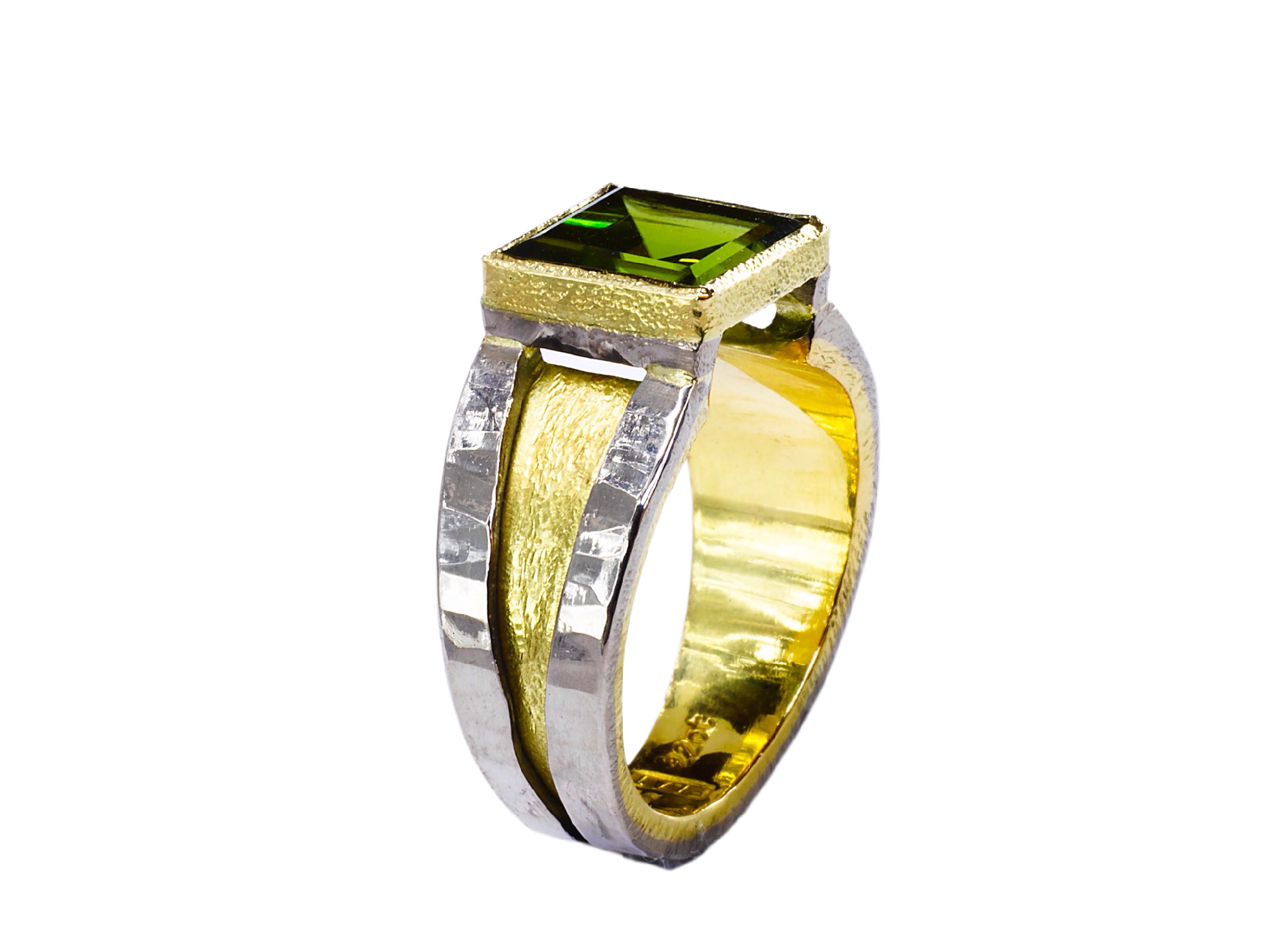 This chunky Platinum /18ct gold ring with a square peridot set in 18ct gold was designed in our studio, it can be made to order to your requirements (please enquire for a quote)
