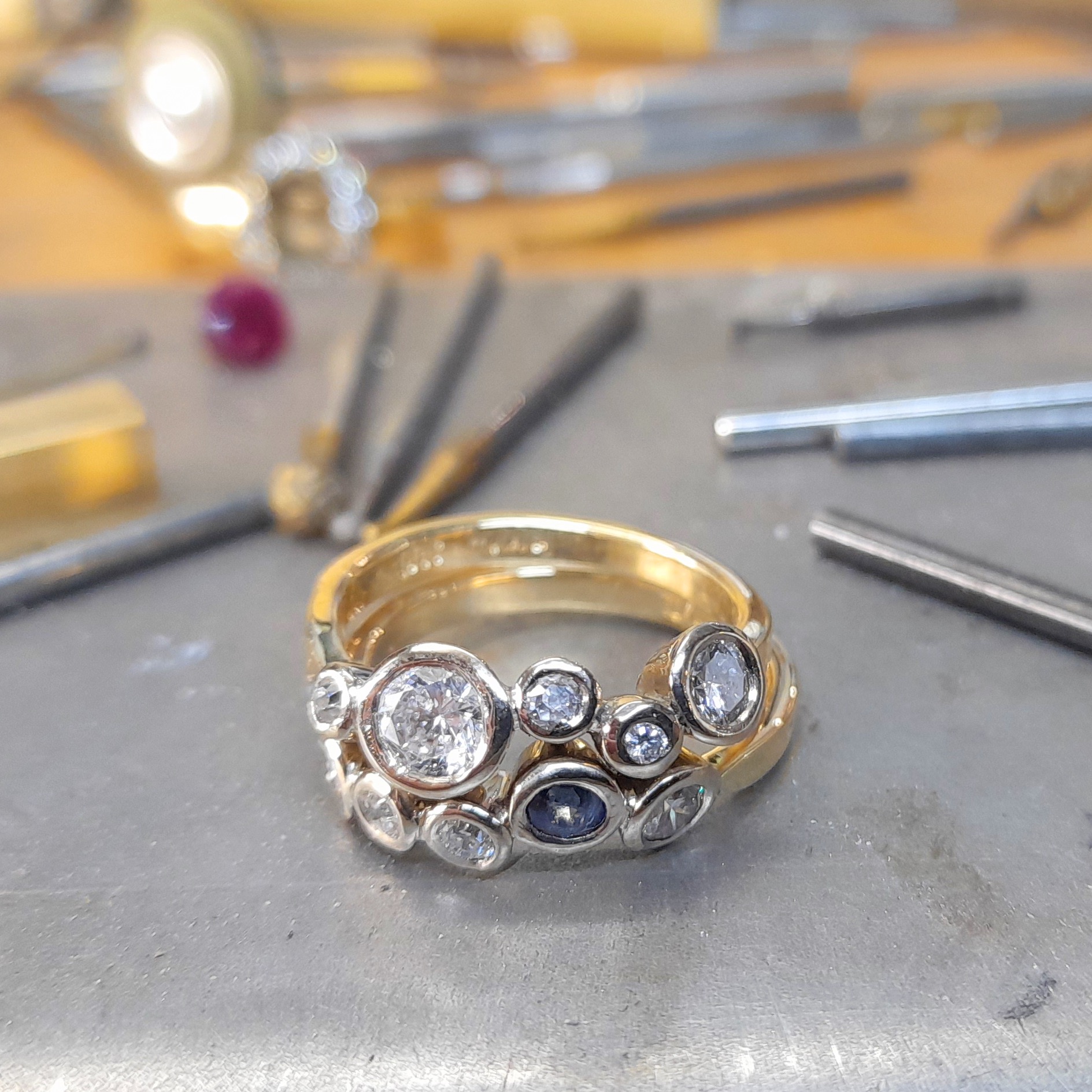 The customer wanted all the 18 ct rings to be made into a pair of stacking rings sett with the diamonds and sapphire in a random line.