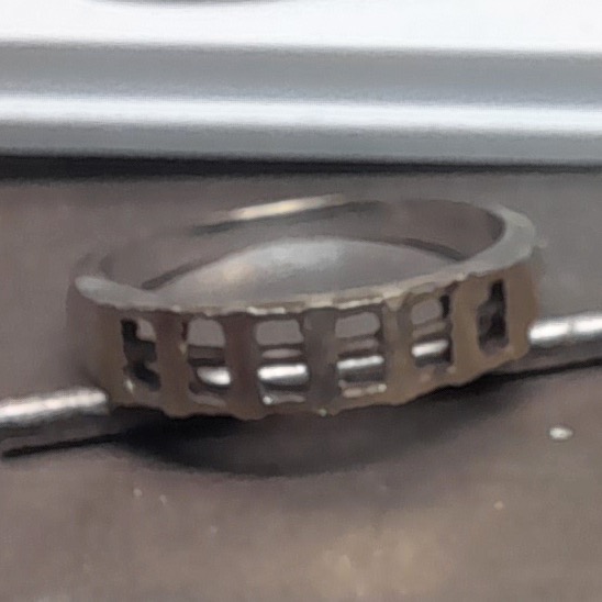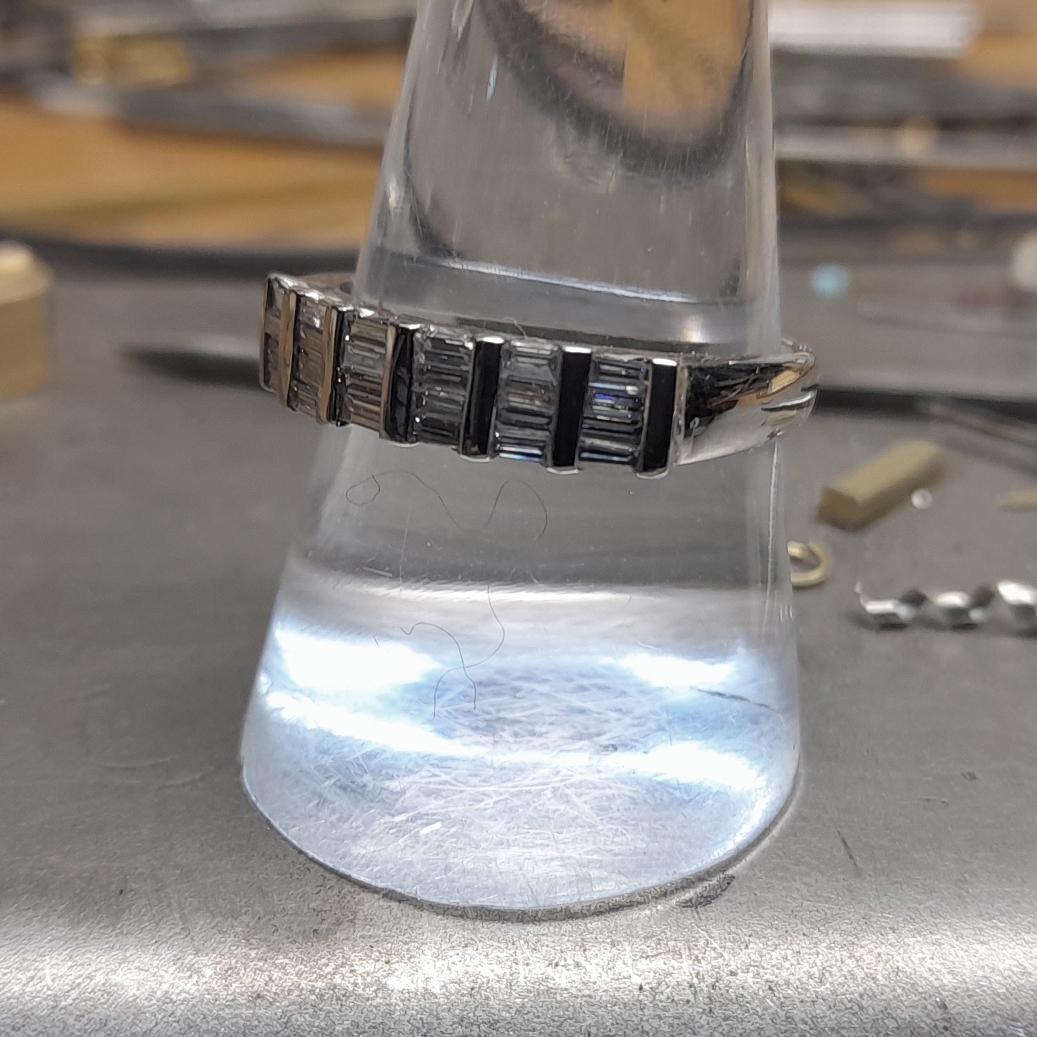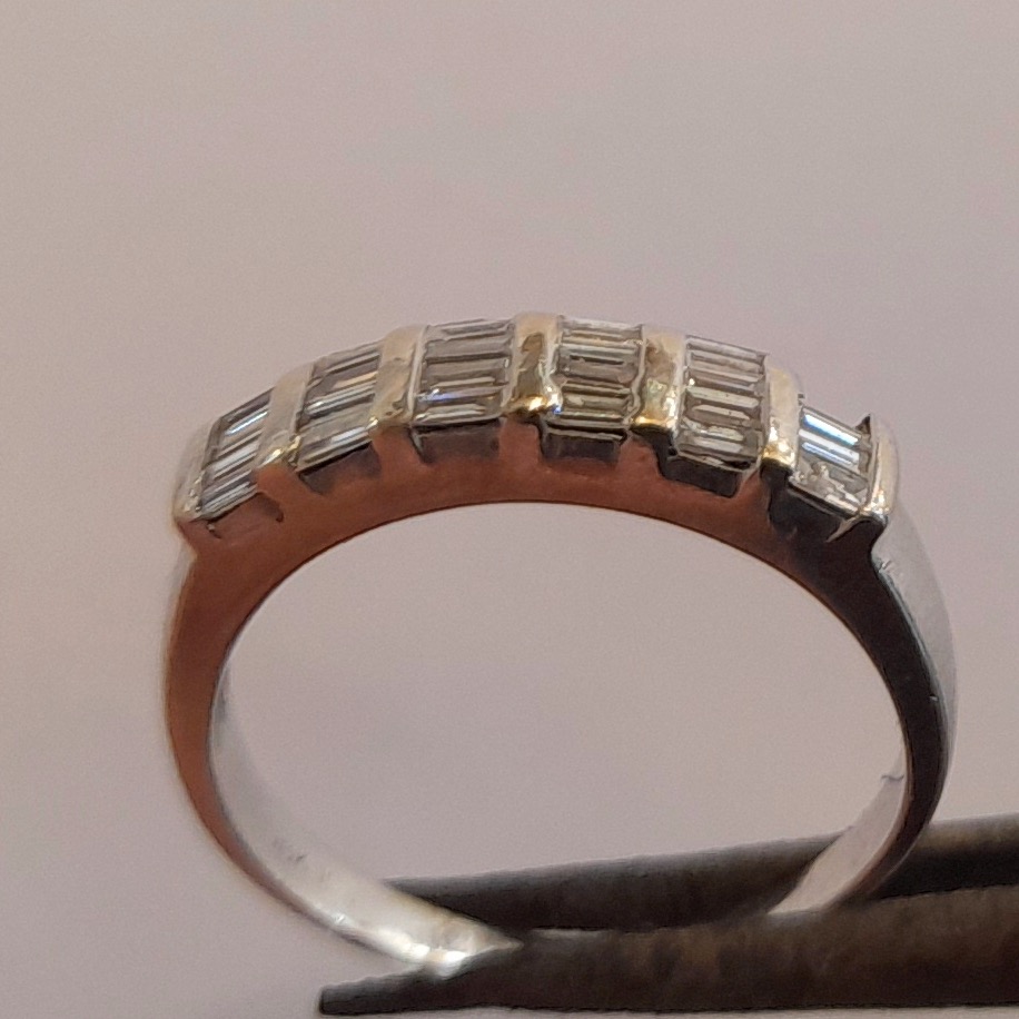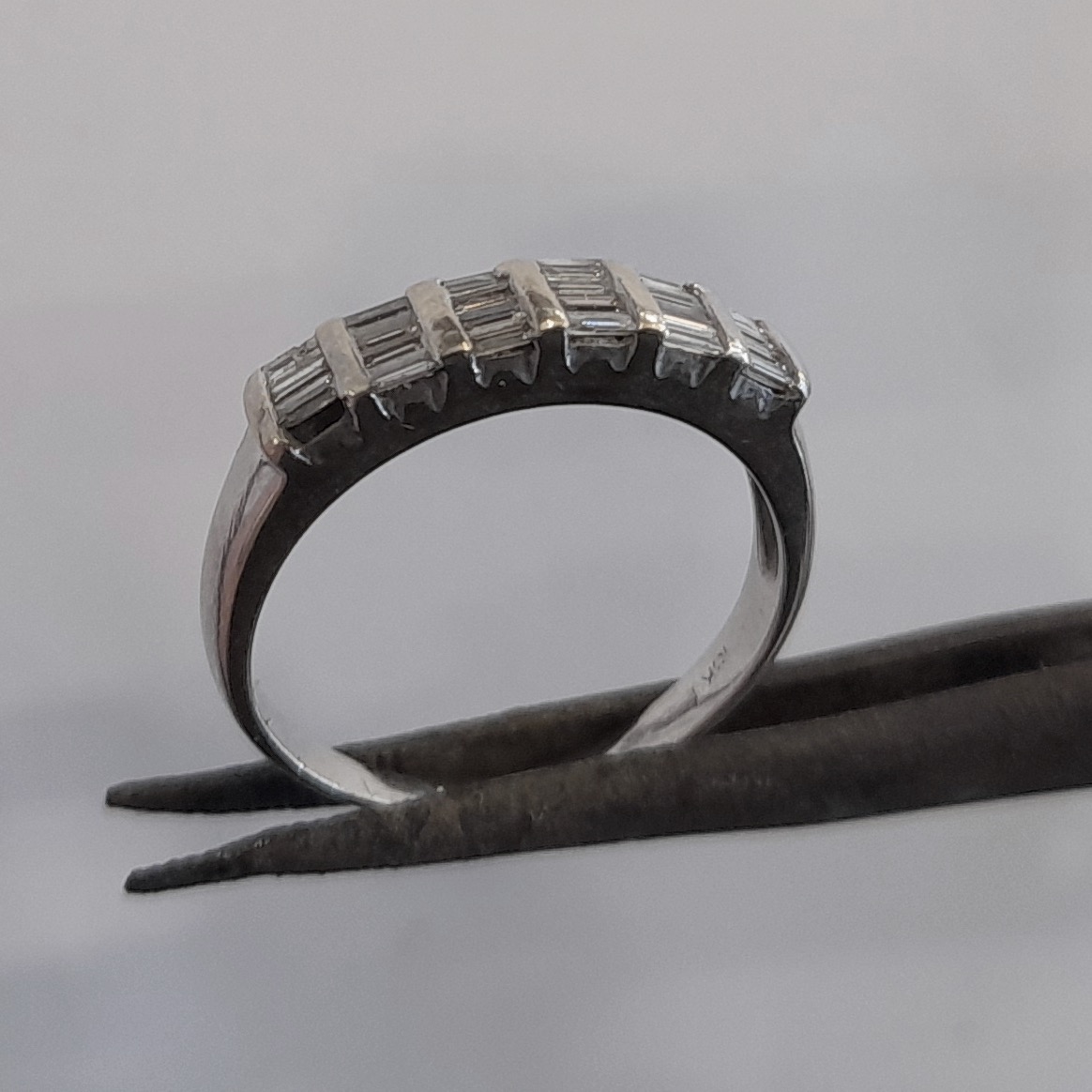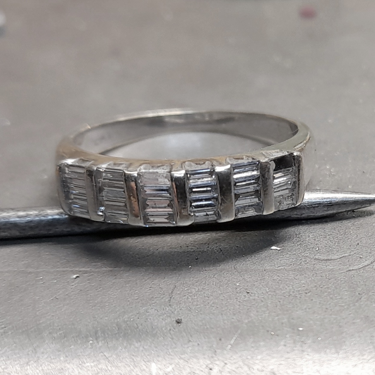 1. Assessment  of the ring and photos taken.Two of the 24 baguette diamonds are missing, another two are badly chipped.The remaining diamonds show signs of wear but are good.The white gold bar settings are all worn down the ring shank needs a emery and polish.